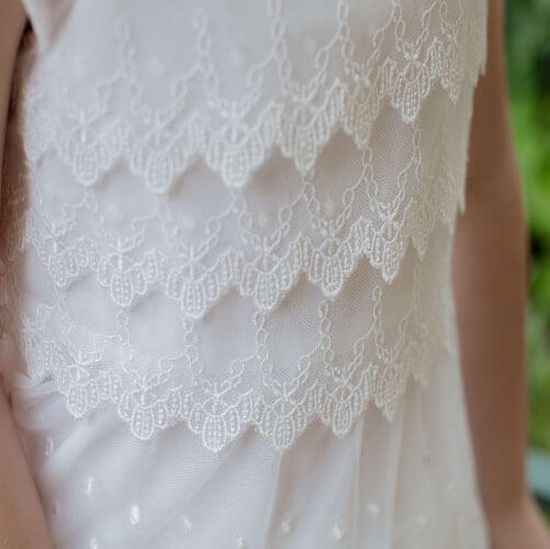 If your little one loves lace, this is the Baptism or Communion dress for her. Delicate layers of tricot lace with scattered embroidered dots, flowers and scalloped edges. Simple square neckline and cap sleeve. Satin tie in the back allows for a perfect fit.