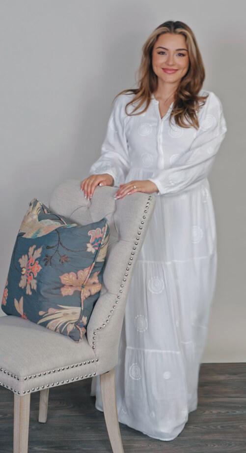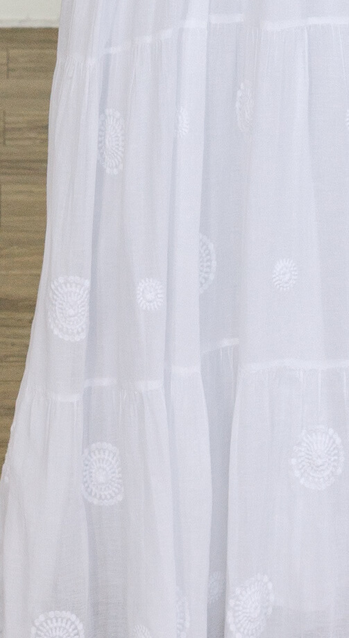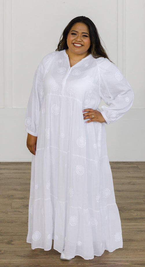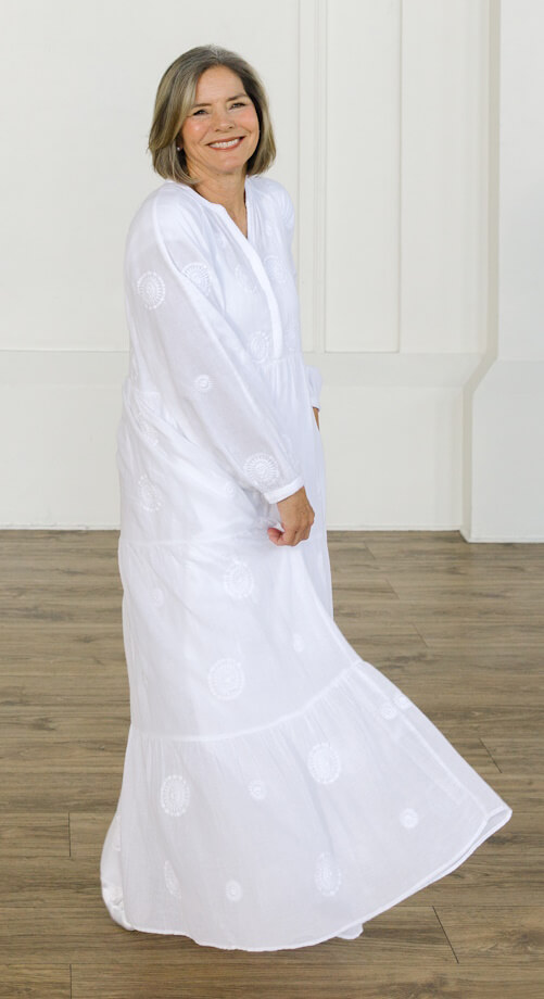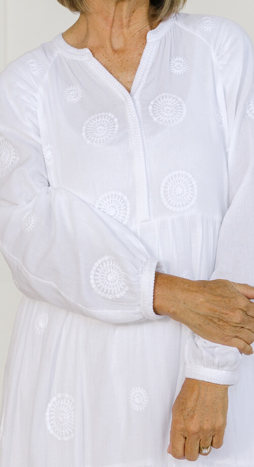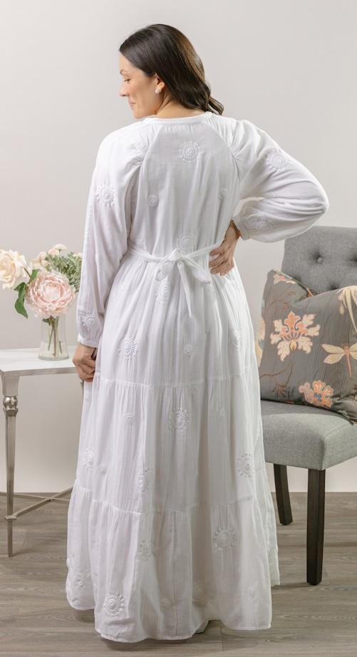 If you’re looking for comfort and ease — this is the dress!  Two layers of breathable cotton gauze trimmed with ropes of embroidery at the neck and cuffs.  Gauze is embroidered with beautiful sunburst medallions.  Because we listen to our customers, there are raglan sleeves, snaps at the neck and cuffs and deep pockets in the side seams.  Waist ties for a customizable fit. A-line with 3 generous skirt tiers. You are going to love this dress.