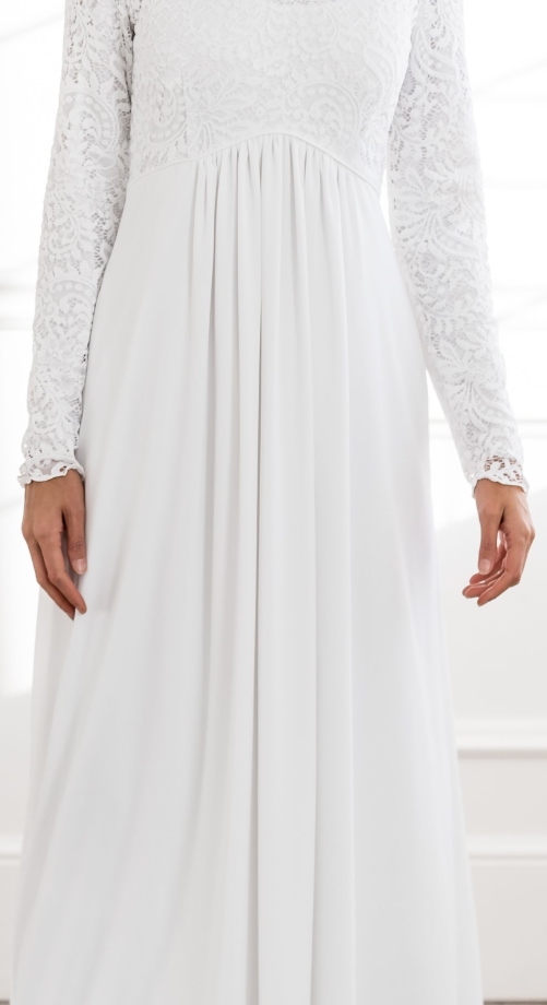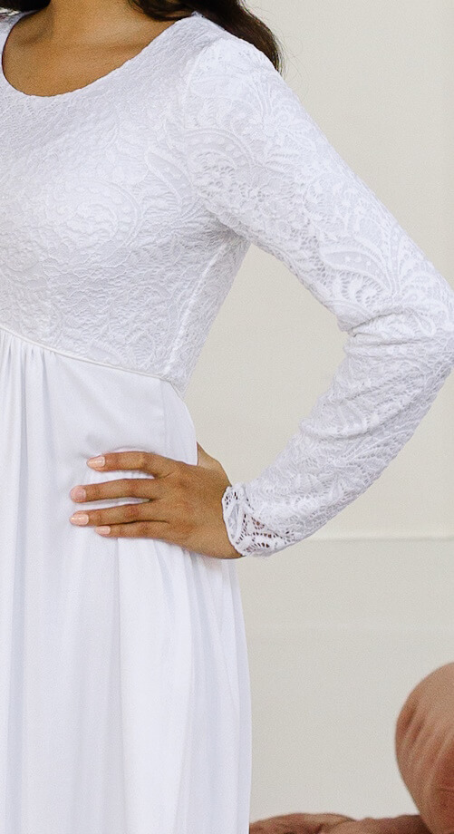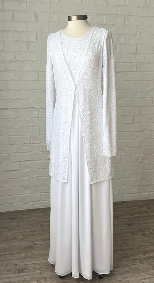 Soft, luxurious raised lace places this white dress in the simply glorious category!  Stretch lace bodice front and back with a sweeping skirt of soft doby fabric. Fully lined with opaque denier that makes this dress simply comfortable and flattering. The elongated back creates a slimming silhouette.  Careful styling, sizing and the piping at the empire waist make this a favorite LDS Temple dress. Kudos to our White Elegance Design Team! Add a matching vest for a two piece option. Side vents on vest make it easy to reach your two deep side pockets.