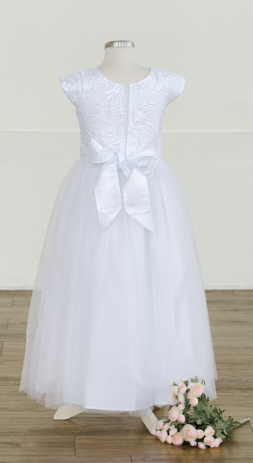 Sequins, embroidery, and organza makes this one of the sweetest in our baptism dress collection. Scalloped lace on bodice is accentuated by a 1″ matte trim with pearl and rhinestone button. Fully lined satin skirt with beautiful ties for a perfect fit. Cap sleeve. Back zipper.