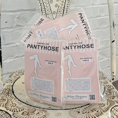 Silky sheer, white control pantyhose with reinforced toe. Hand wash/drip dry.