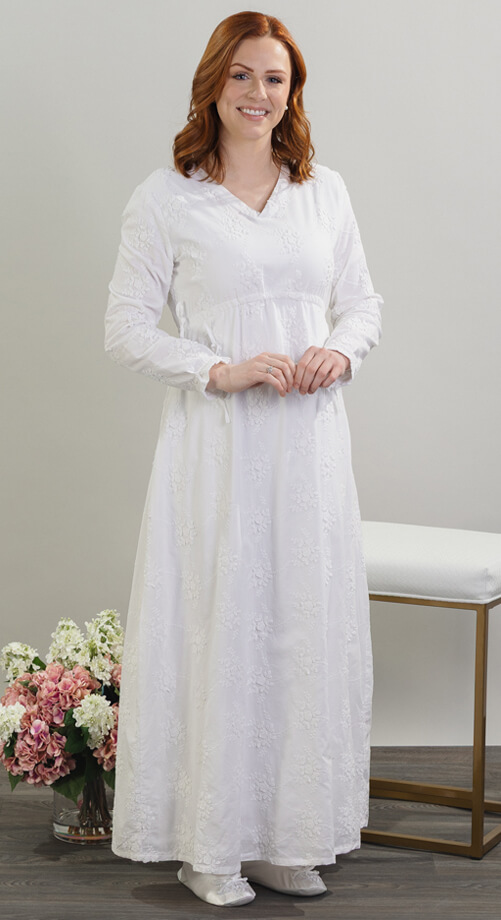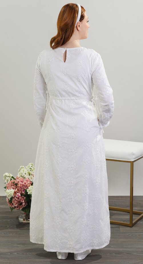 A striking new cotton fabric with floral and vine 3D embroidery is the centerpiece for this simple column style. Fully lined in lightweight cotton. The rounded empire waist is cinchable to your desired fit with functional drawstrings that you can tie into bows (or plain knots) at the sides — AND for a finishing touch — cinchable wrist ties that can create a ruffle and bow (if you like bows). V-neck with a keyhole back.
